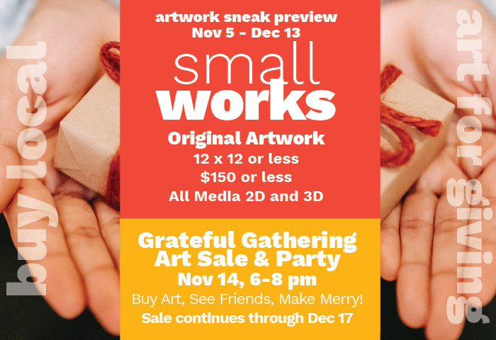 Preview Week, November 5 – 13. Leisurely peruse the artwork in the Main Gallery. Small Works objects will be available for purchase at the Grateful Gathering on November 14, 6 – 8 pm. Artwork purchases continue through December 17.
