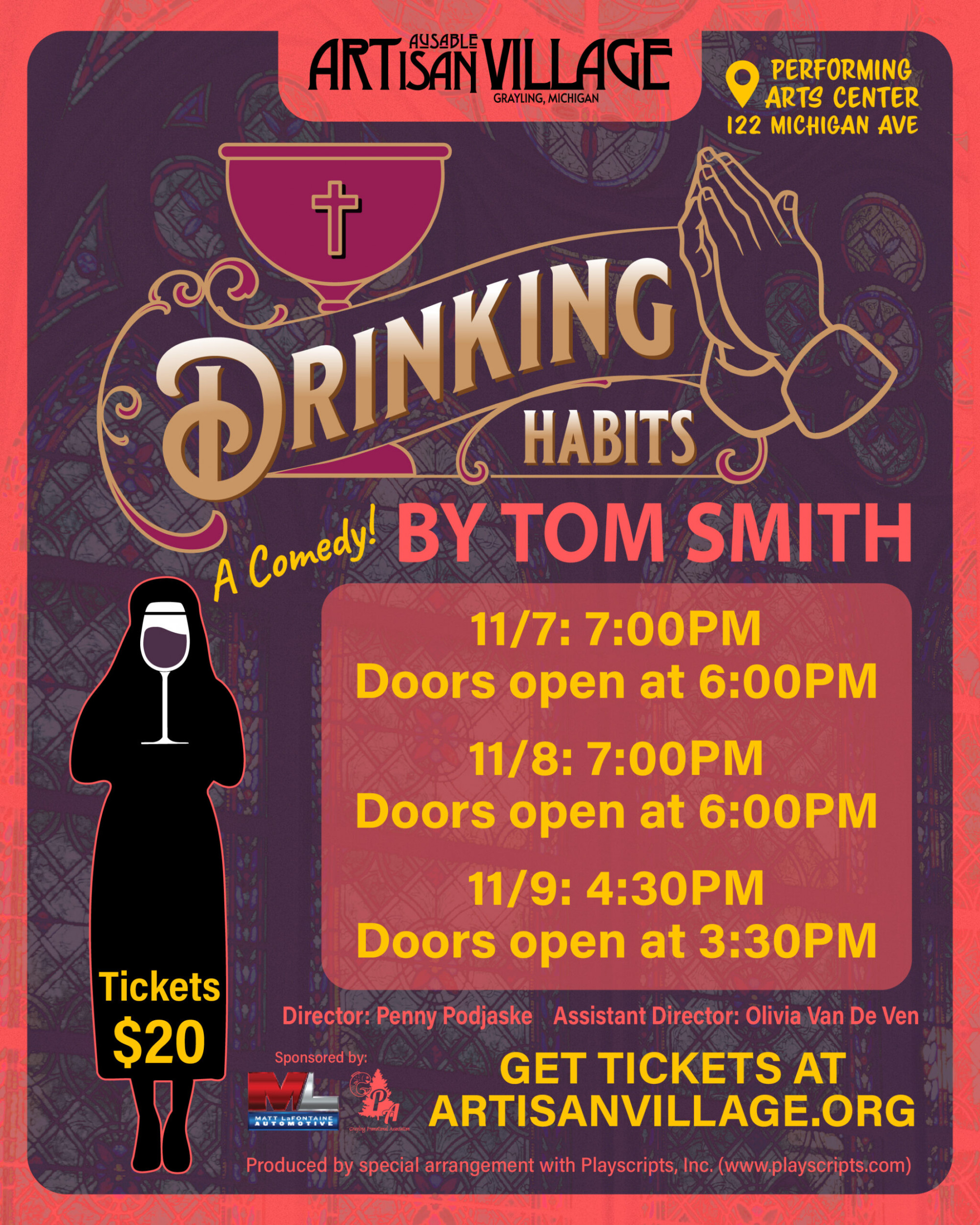 AuSable Artisan Village Community Theatre Presents: Drinking Habits by Tom Smith Accusations, mistaken identities, and romances run wild in this traditional, laugh-out-loud farce! At the Sisters of Perpetual Sewing, two nuns have been secretly making wine to keep the convent’s doors open. But when reporters—and former fiancées—Paul and Sally go undercover as a priest and a nun..