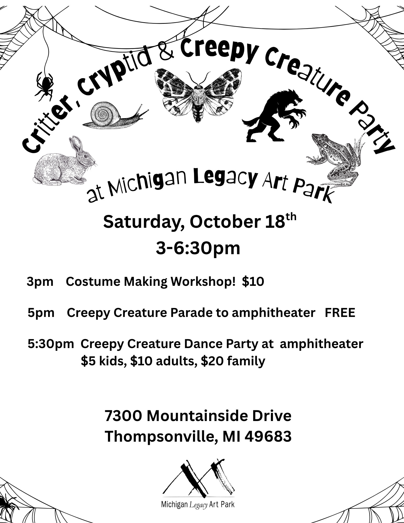 5:00 Cryptid and Creepy Creature Parade! Begin at the Art Park entrance, and proceed to the Amphitheater for a dance party.