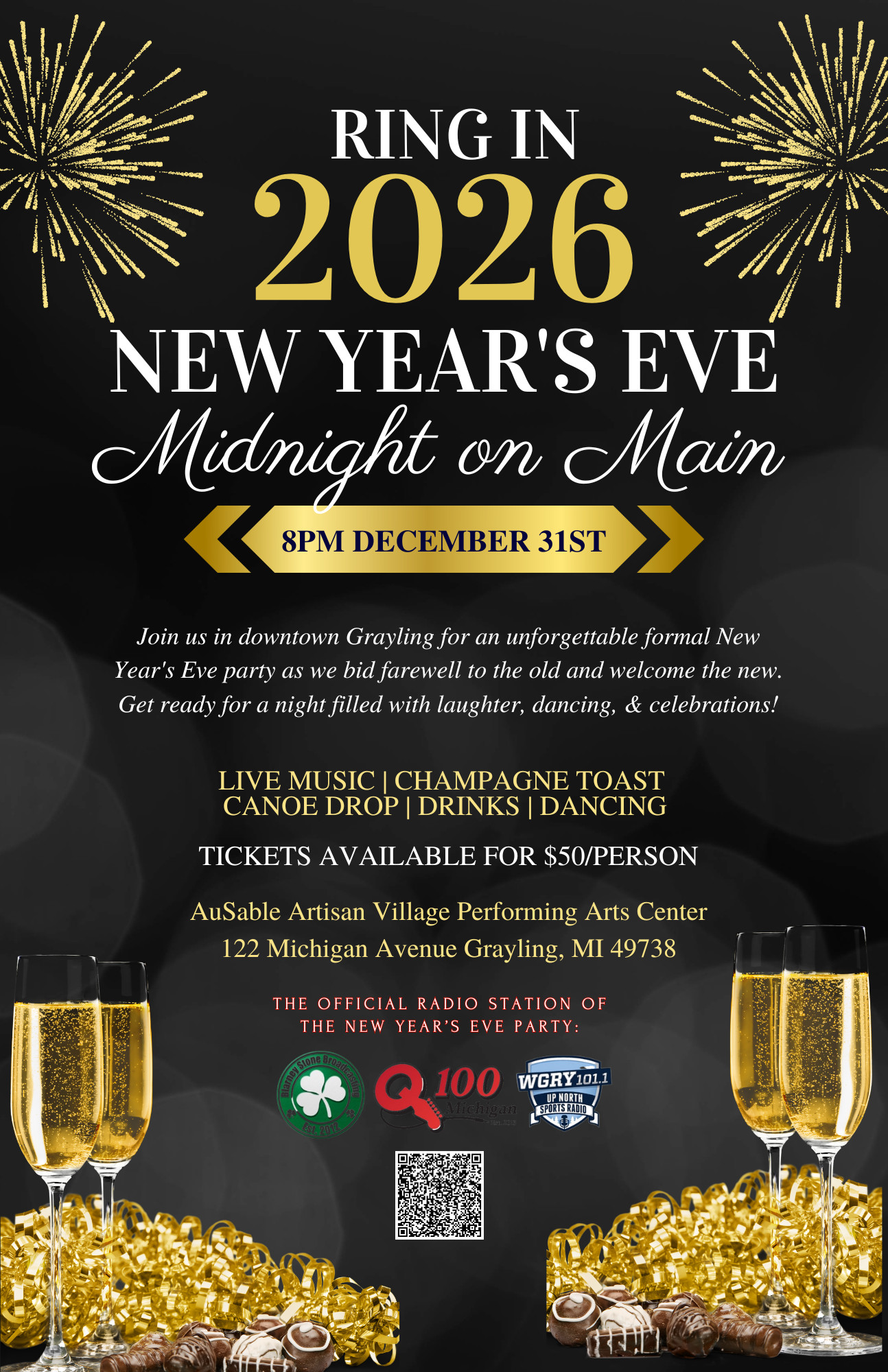 Ring in 2026 in style at Grayling’s premier New Year’s Eve celebration — Midnight on Main! Join us for an unforgettable evening of live music, dancing, drinks, and a midnight champagne toast as we count down to the new year together. Experience the excitement of the Canoe Drop, a beloved Grayling tradition, and celebrate surrounded by friends, family, and community.
