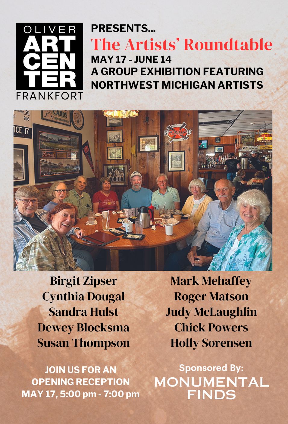 For more than 30 years about a dozen artists have met weekly over breakfast in Empire, Michigan. Among the members are working artists, retired art educators, and others with an art interest. The Artists’ Roundtable, a retrospective exhibition of their work will open with a reception on Friday, May 17 from 5:00 – 7:00 pm. The exhibition continues through June 14. An artists’ talk will take place in the gallery on June 14 from 4:00 – 6:00 pm.